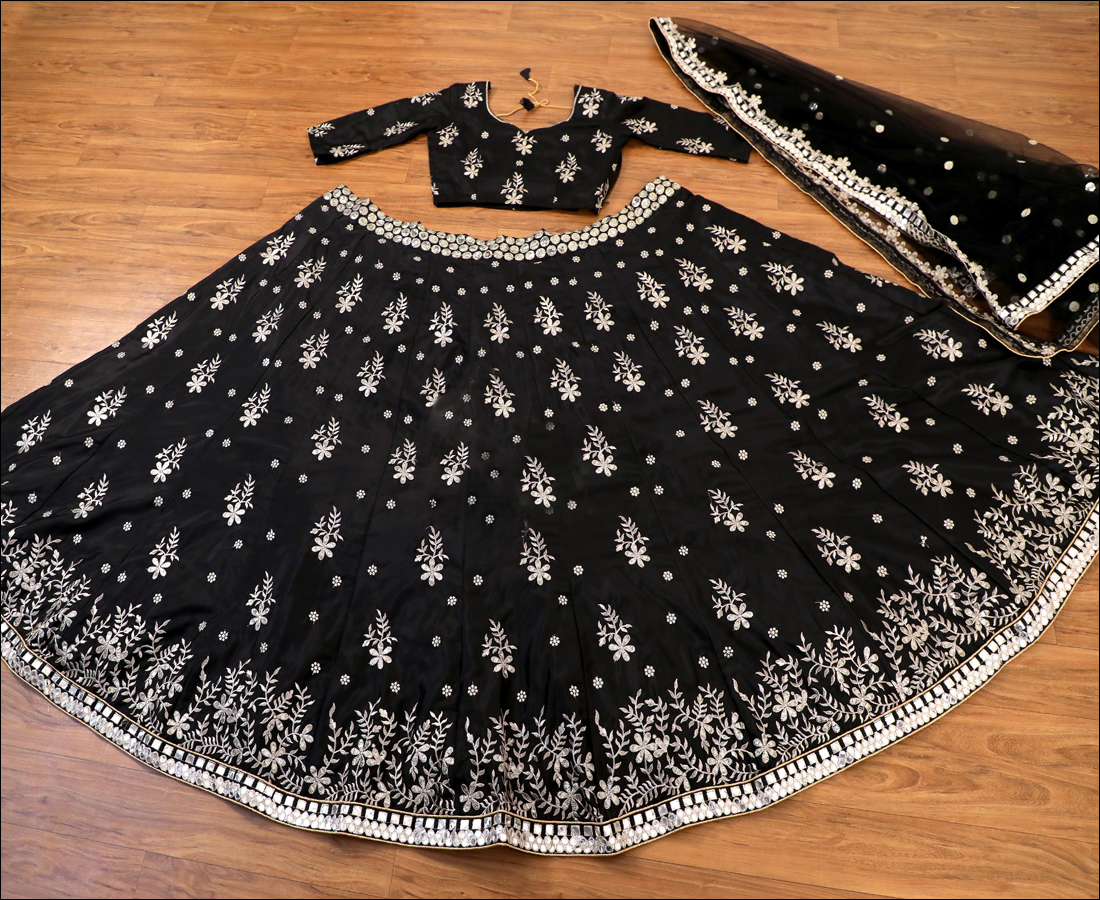 🌼WORK:- PAPER MIRROR WORK IN BOTTOM LACE BORDER AND 3MM SEQUINS WITH JARI EMBROIDERY WORK IN LEHENGA KALI